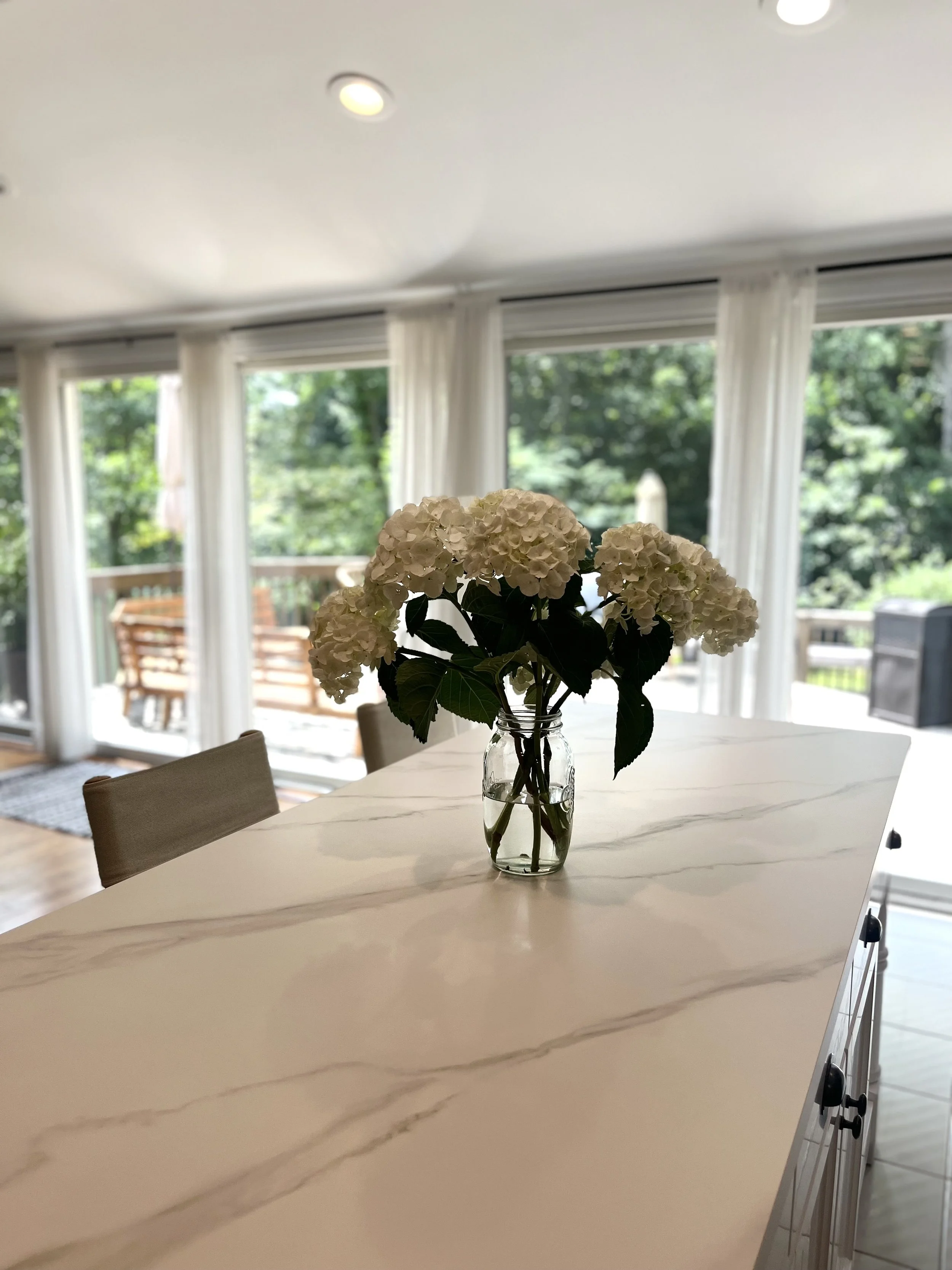 White hydrangea flowers in a glass jar on a white marble countertop inside a bright room with large windows and outdoor greenery.
