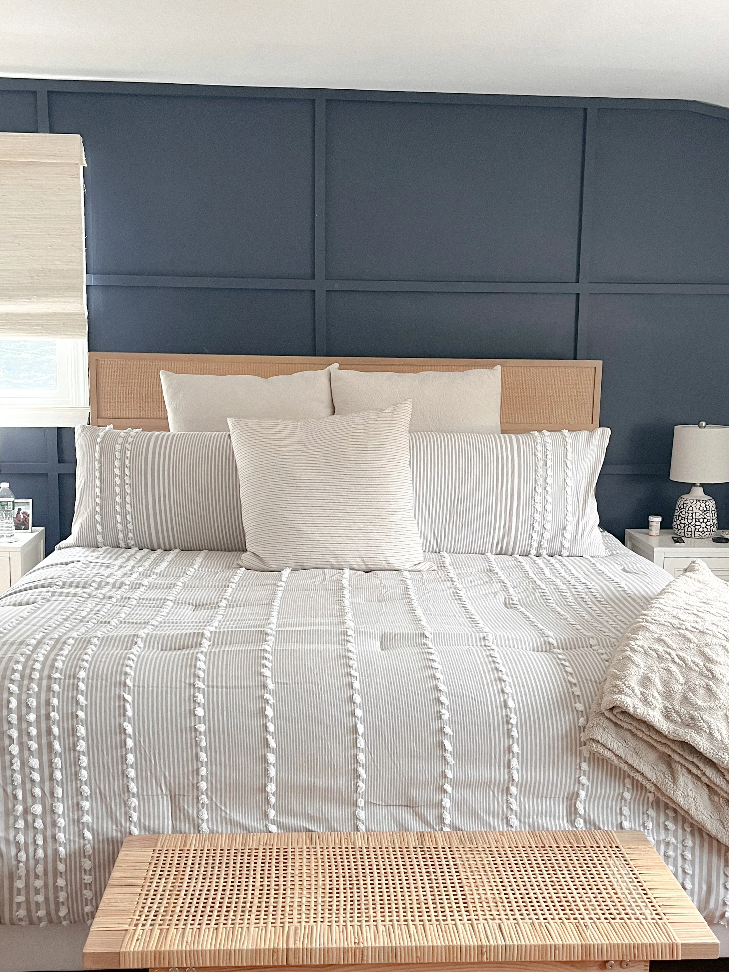 A neatly made bed with white and beige striped bedding, multiple pillows, and a folded beige blanket at the foot, next to a white nightstand with a lamp, in a bedroom with dark blue paneled accent wall.