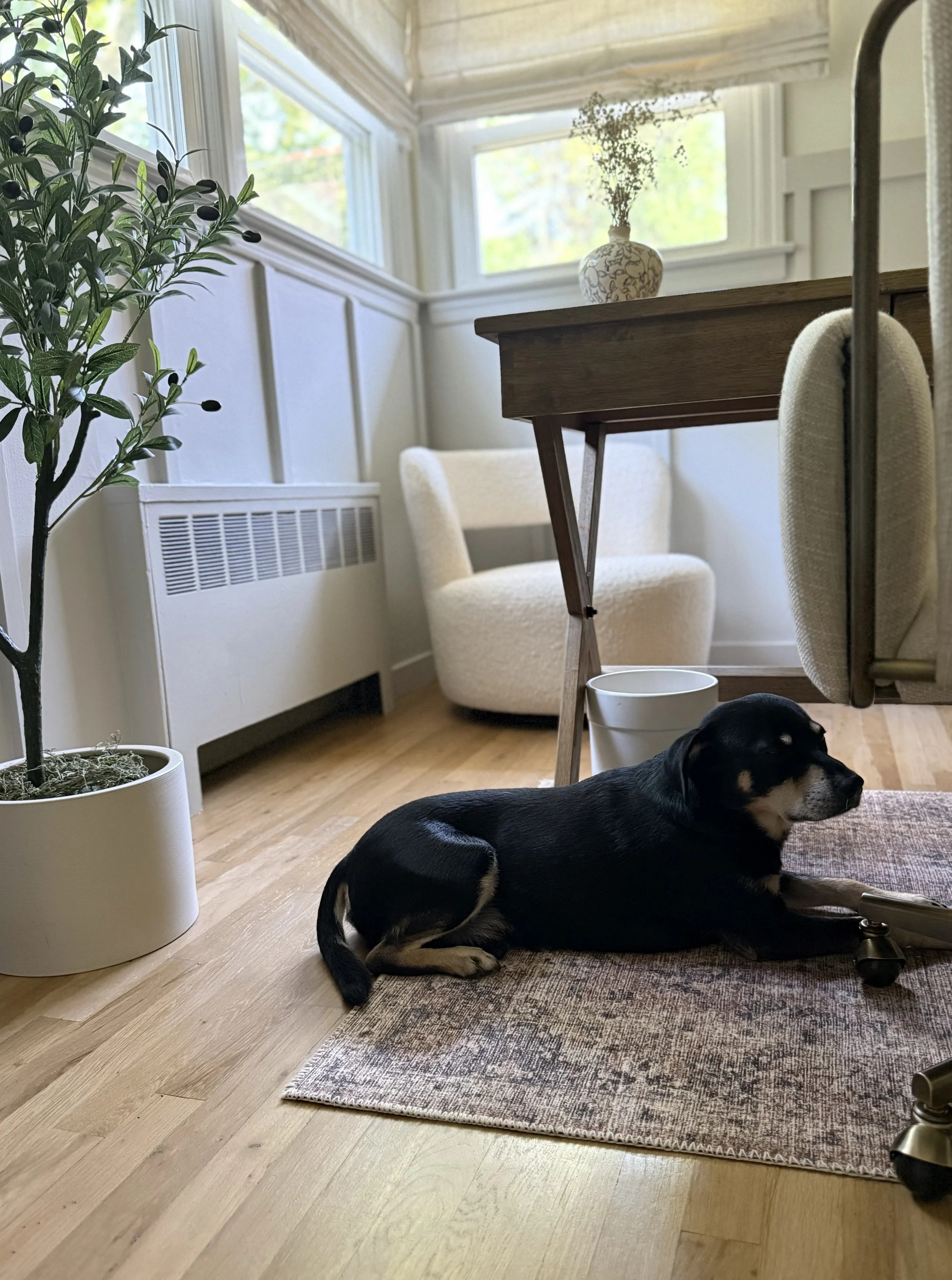 A small black dog with tan markings lying on a rug in a bright room with wooden floors, near a white potted plant, a wooden table, an upholstered chair, and a window with natural light.