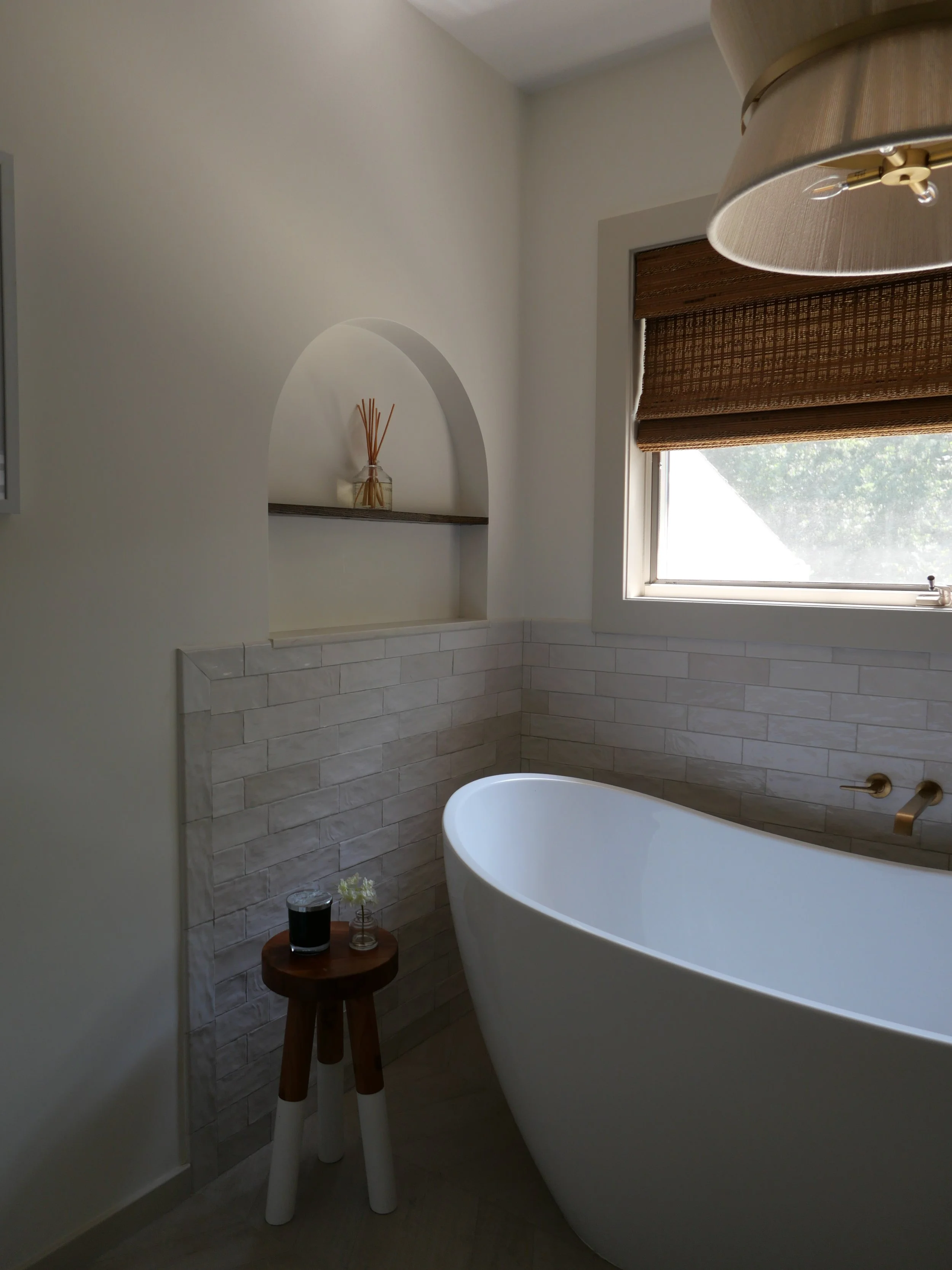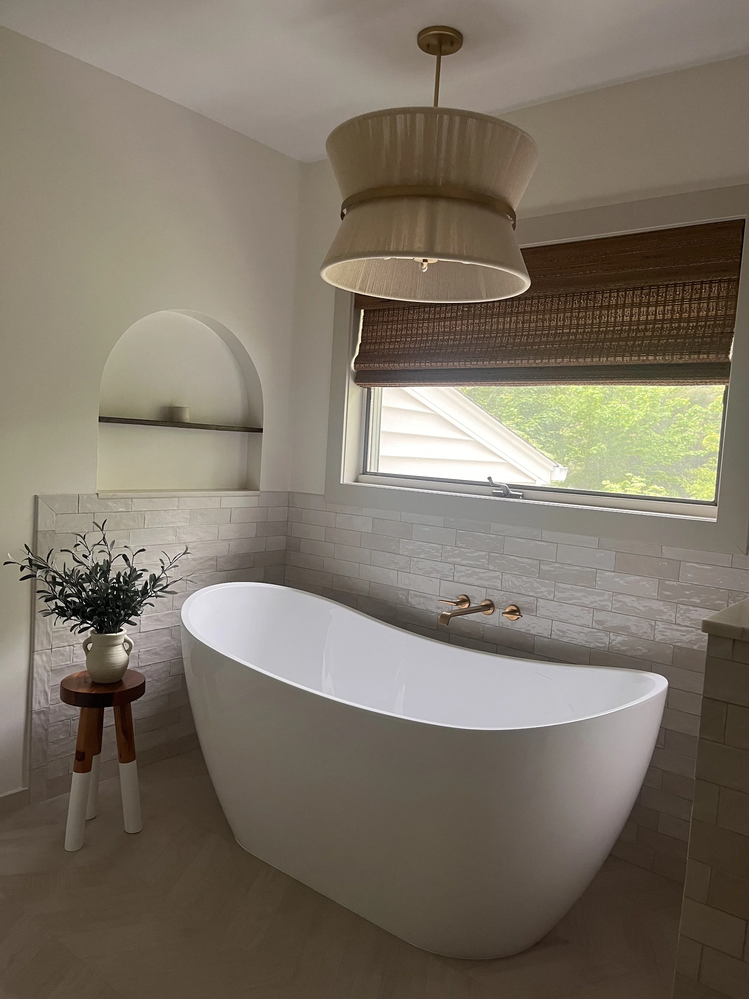 Modern bathroom with a white freestanding bathtub, a window with a brown shade, a small plant on a wooden stool, and a ceiling light