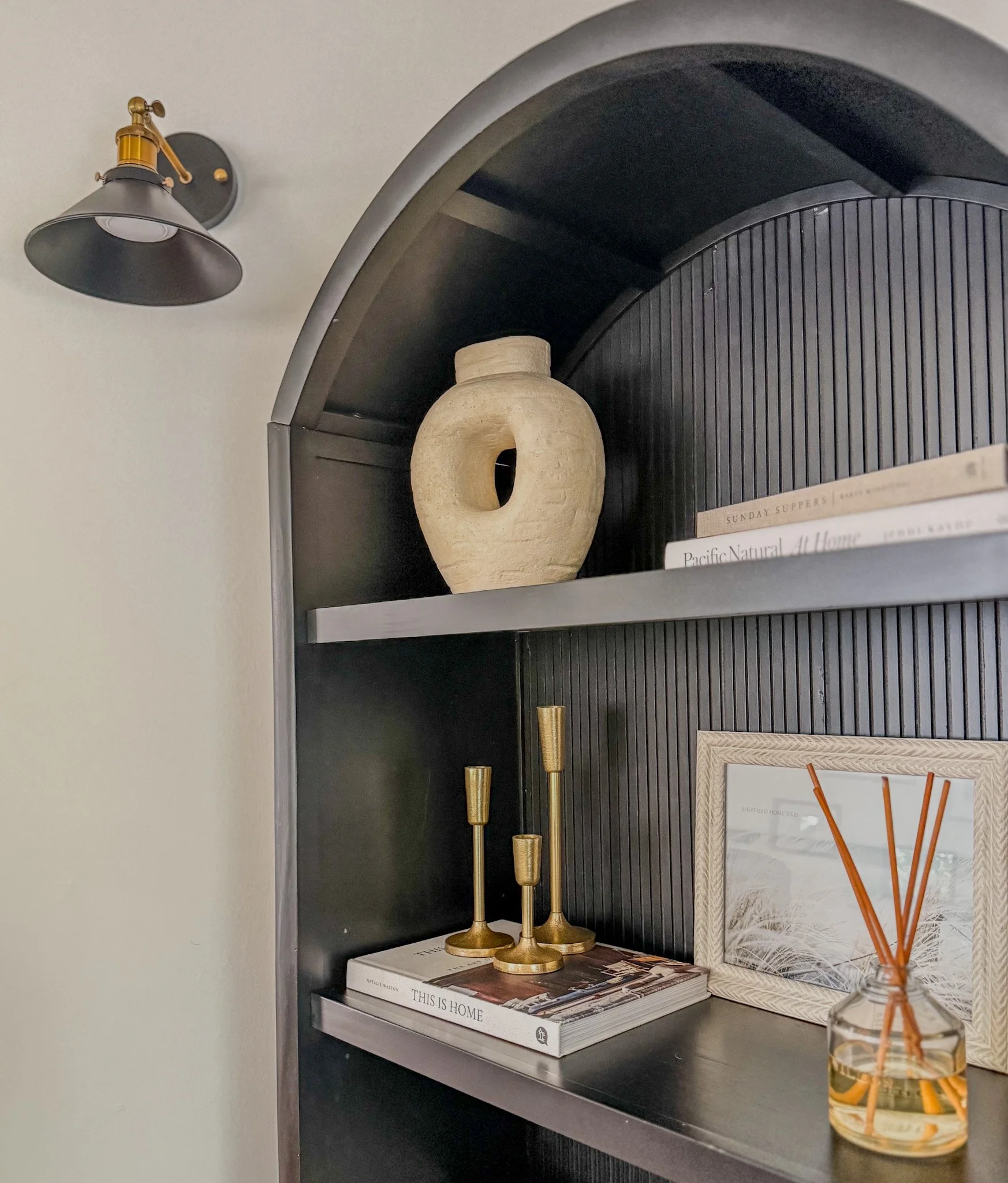 A black curved bookshelf with a decorative beige ceramic vase on the top shelf, gold candlesticks and a framed photo on the lower shelf, along with a reed diffuser and some magazines.