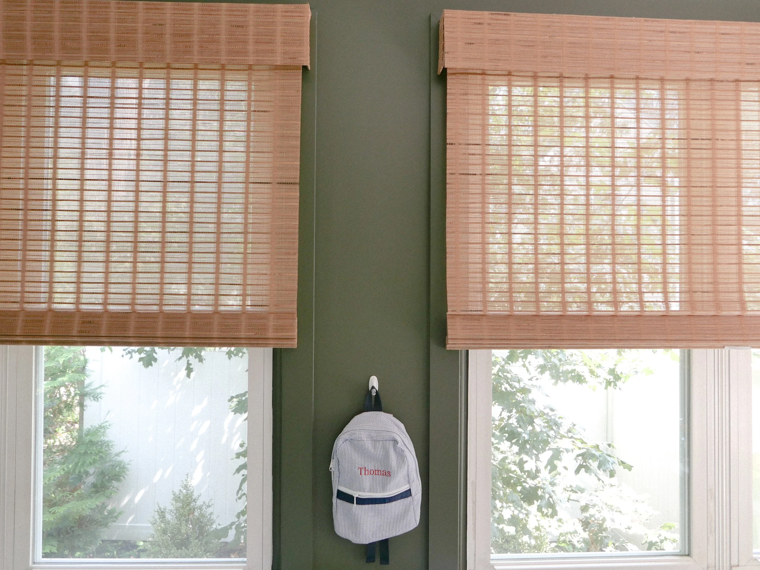 A green wall with two windows covered by light pink bamboo blinds, and a gray backpack hanging between the windows with the name 'Thomas' embroidered in red.