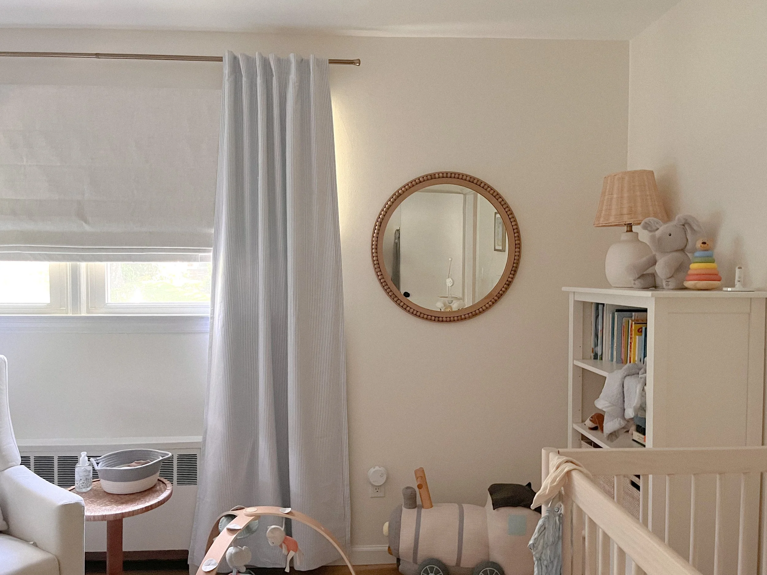 Interior of a nursery with a white dresser, a white high-back armchair with embroidered deer, a window with white curtains, and a wall hanging with the name Thomas Troy.