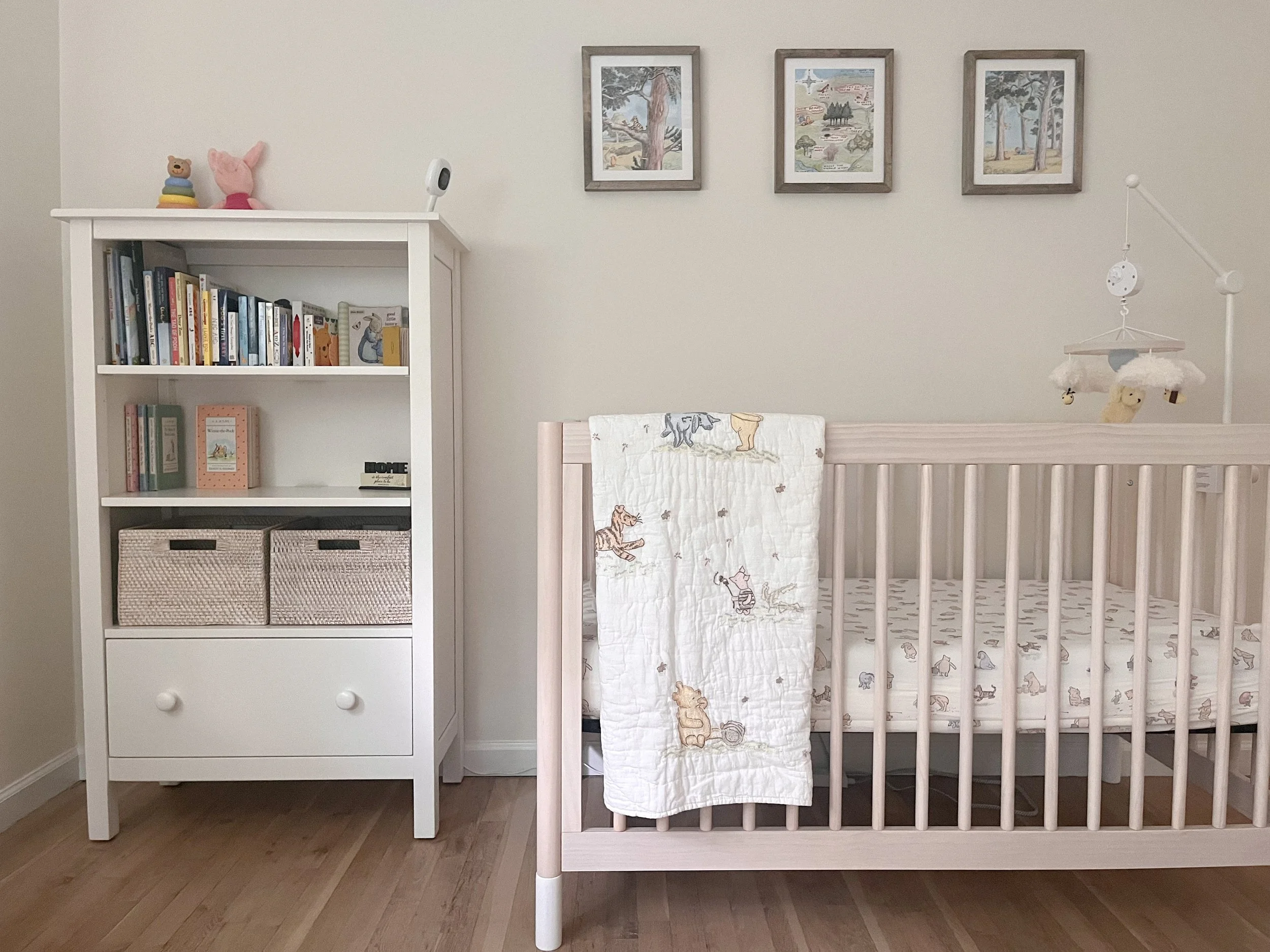 A baby's nursery with a white bookshelf holding books and woven baskets, a crib with a whale-illustrated quilt, and three framed pictures of trees and landscapes on the wall.