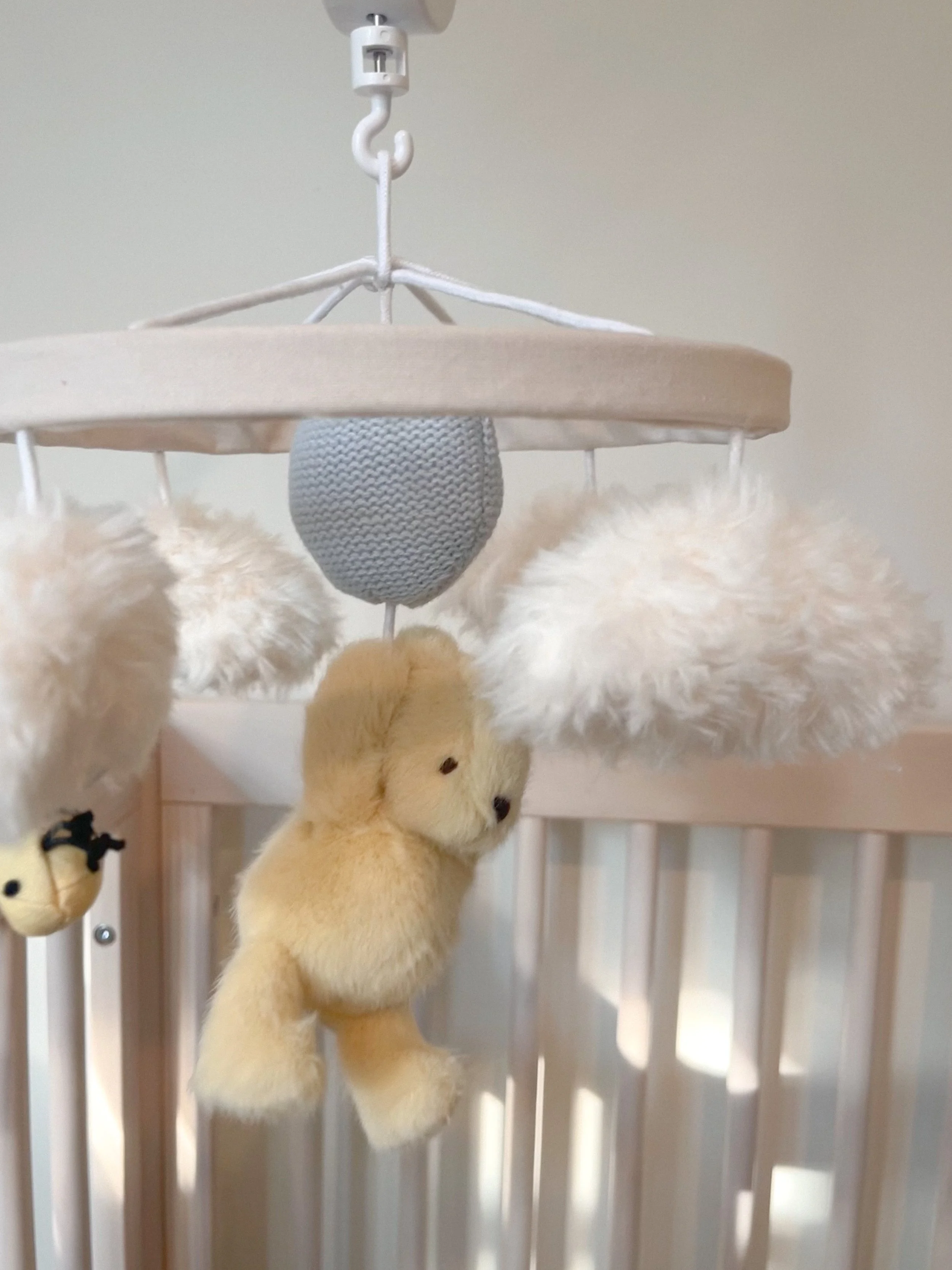 A baby crib mobile with plush toys hanging, including a small beige teddy bear, white fluffy pom-poms, and a gray knitted ball, mounted on a white metal frame.