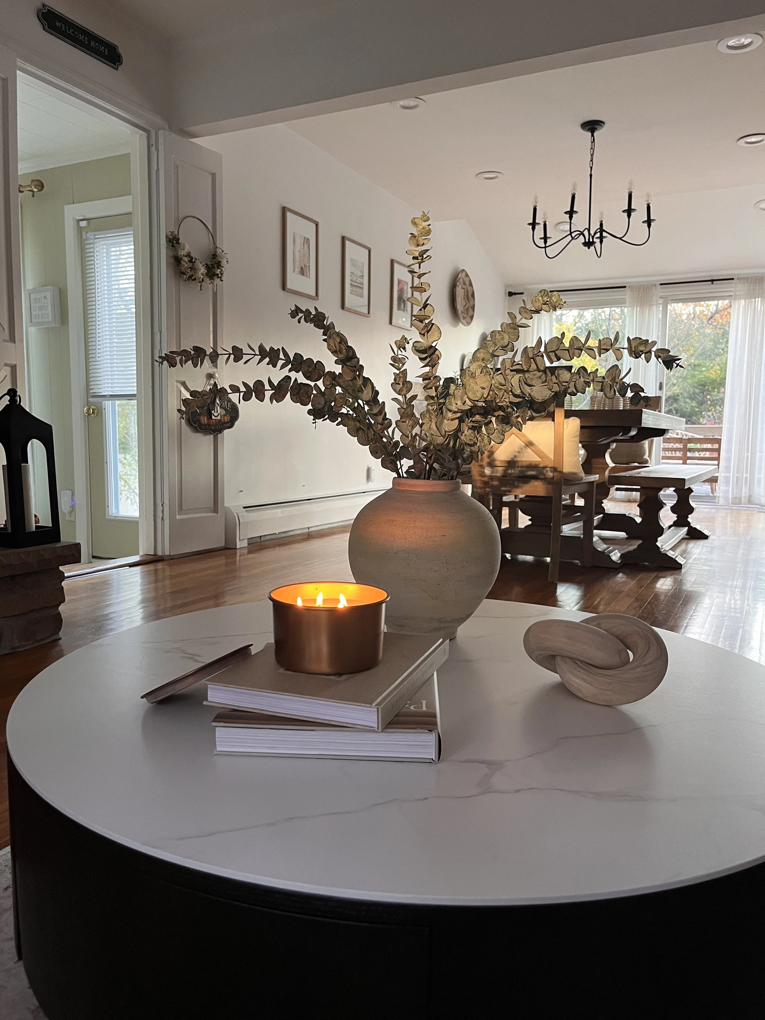 A round marble-top table with a lit candle in a bronze holder, two stacked books, a wooden knot sculpture, and a large vase with dried eucalyptus branches inside. In the background, a dining area with a wooden table and benches near a large window wi