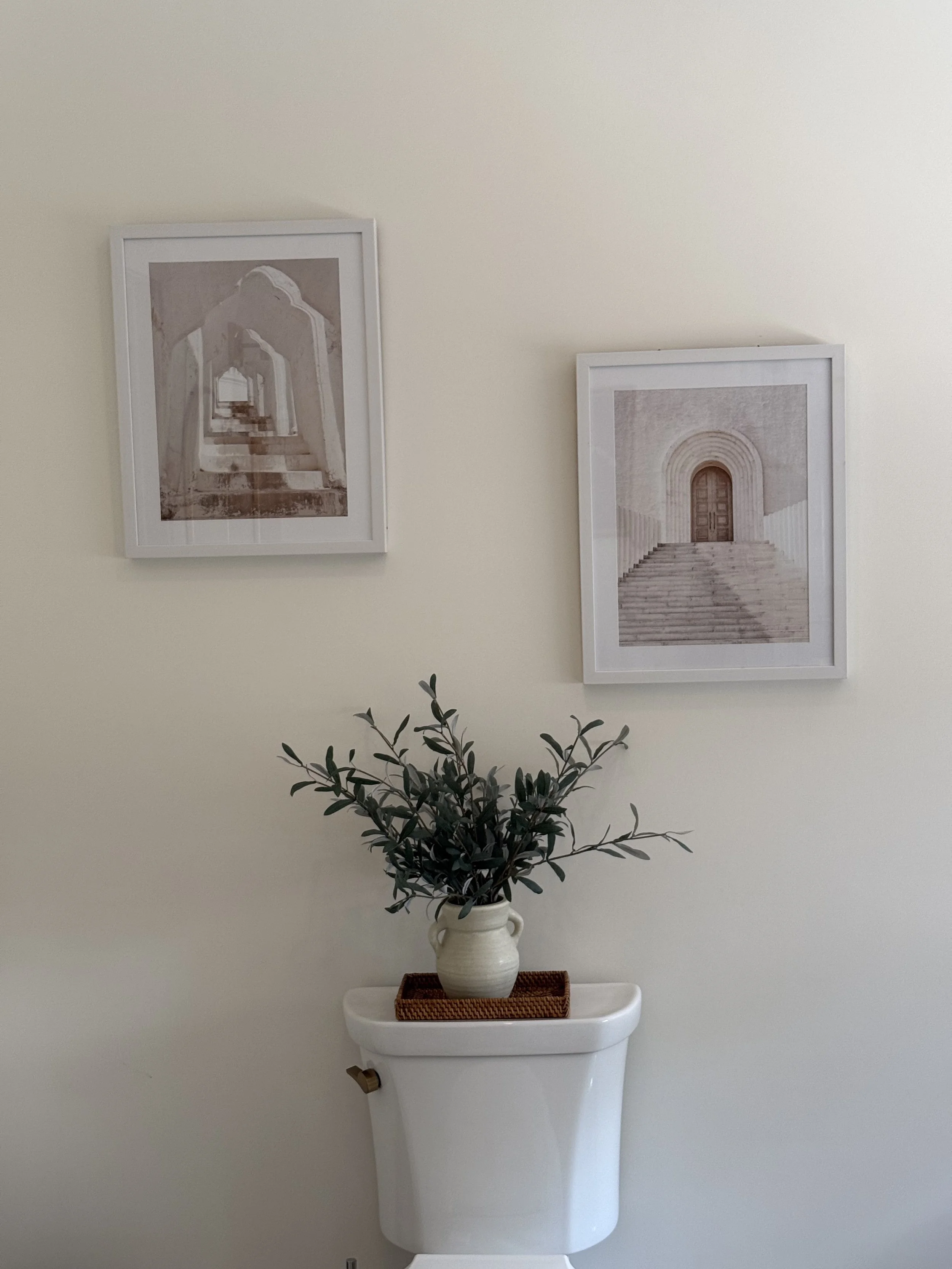 Decorative arrangement on a white toilet tank with two framed pictures of architectural doorways on a pale wall.