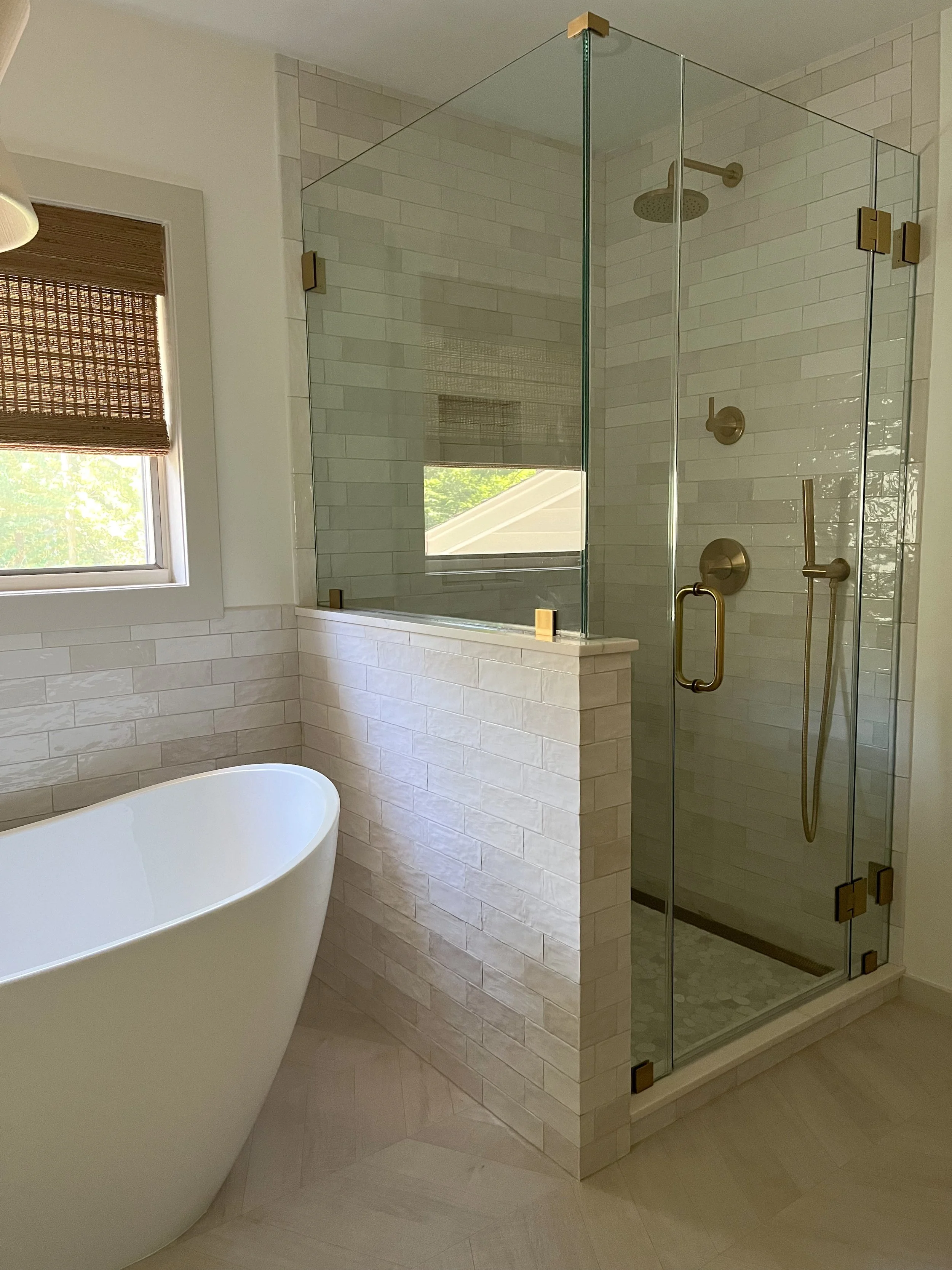 Bathroom with a freestanding bathtub and a glass-enclosed shower area with gold fixtures, a window with a brown woven shade, and beige subway tile walls.