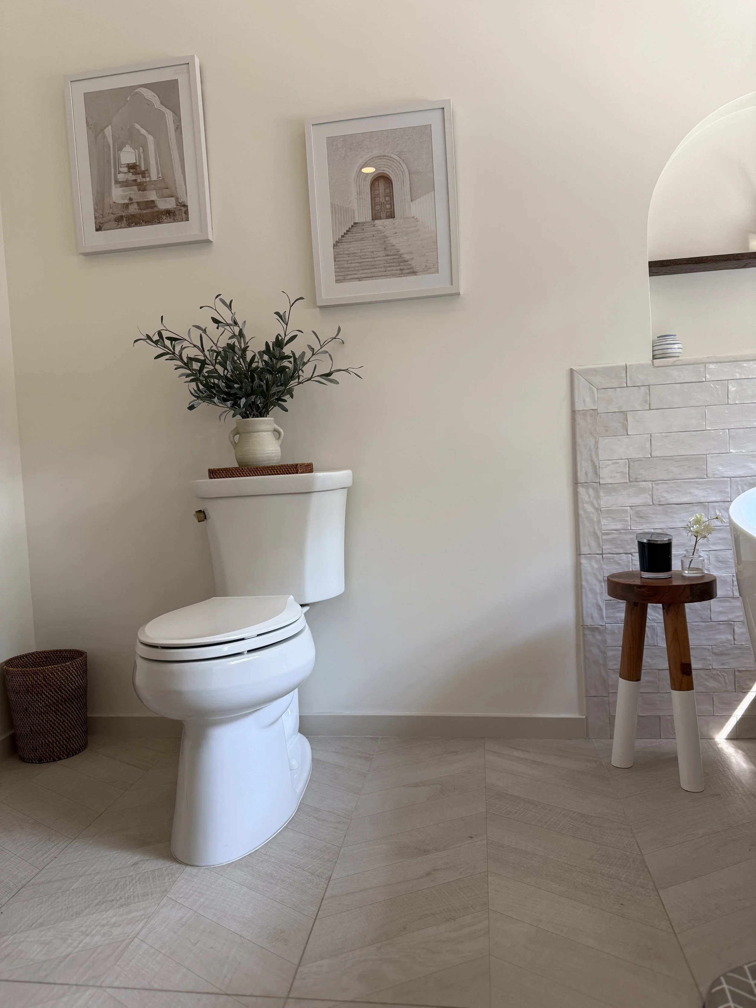 Minimalist bathroom with a white toilet topped with a potted plant, framed artwork on the wall, a small wooden side table with black and white decor, and tan tiled flooring.